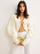 - Design: Shoulder Pads, Button, Pleated