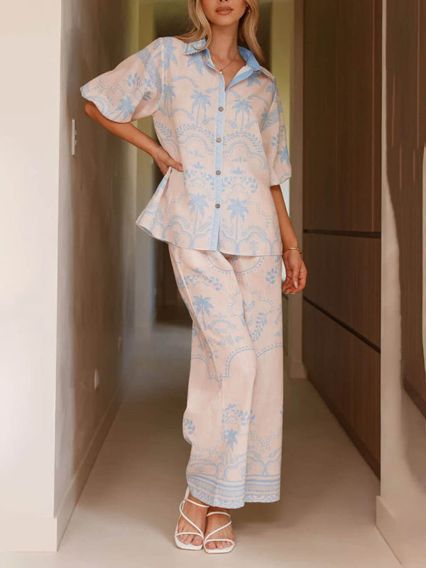 Perfect for casual outings, vacations, or just lounging at home, this set effortlessly combines style and comfort. Pair it with a pair of statement earrings and heels for an elegant evening sophisticated look, or pair it with flats for a casual, effortless look. The printed design is suitable for year-round wear, and you can easily wear it under a blazer or cardigan for added warmth and style.