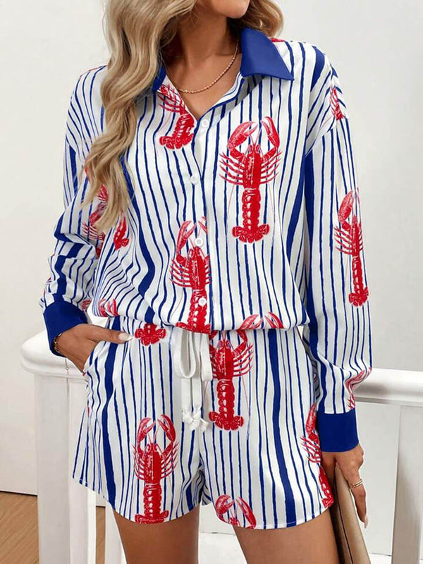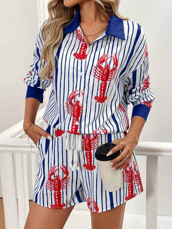 Classic Incredible Lobster Track Print Button Up Lace Up Shorts Set