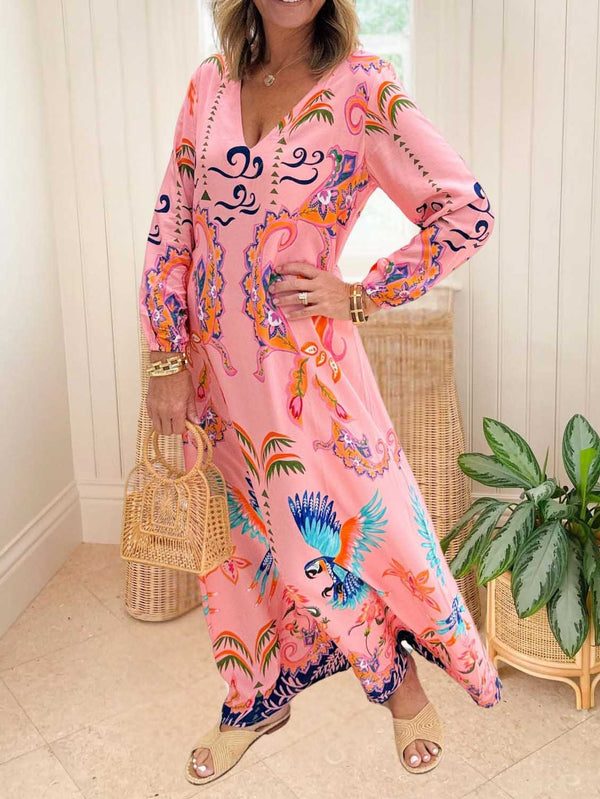 Unique Parrot Print Drop Shoulder Sleeve Maxi Dress